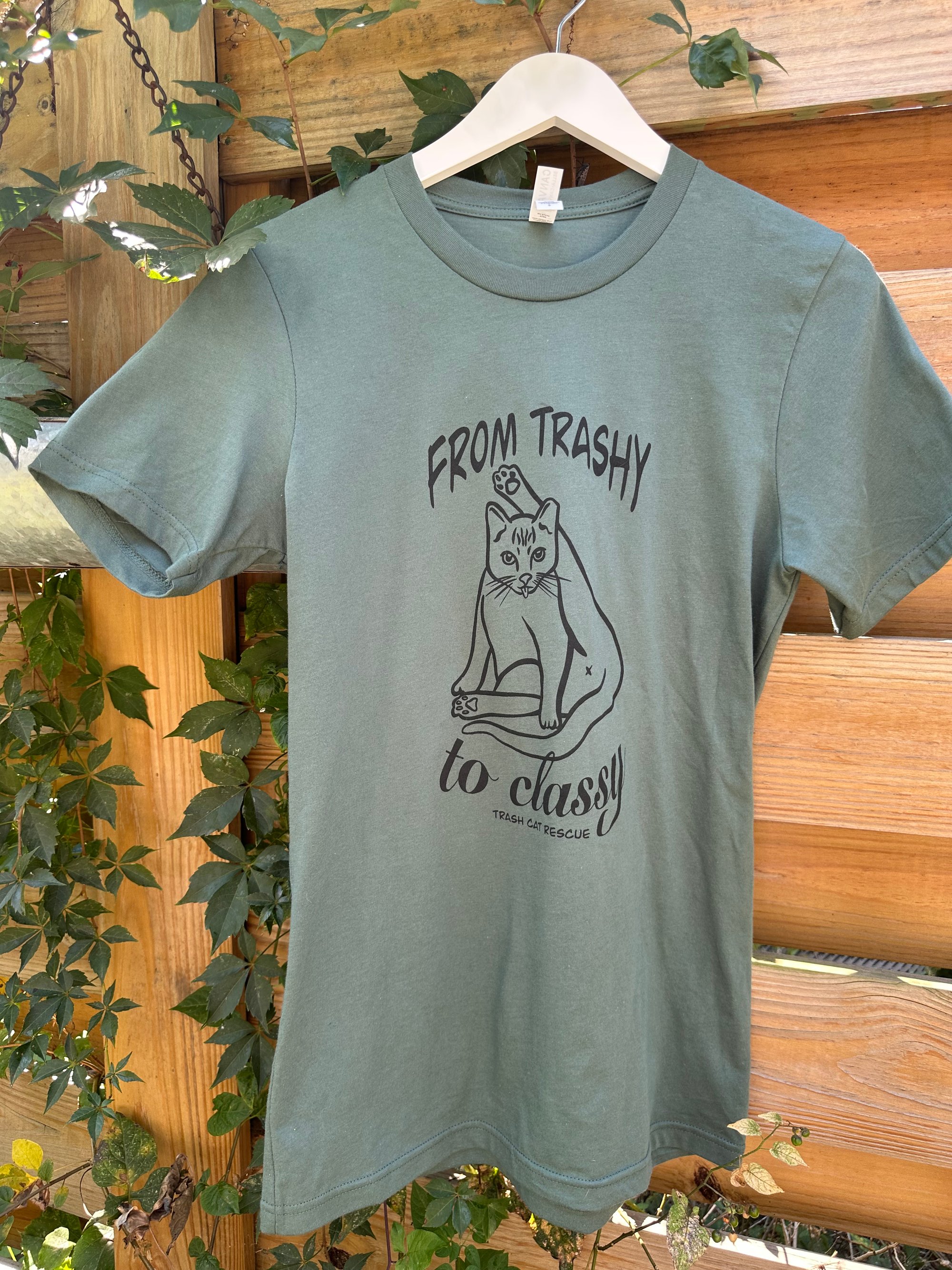They're not always the most glamorous to start, but we love our trashy cats! Celebrate feline glow-ups with this new and improved From Trashy... to Classy shirt on a piney green background. Printed on a soft 100% airlume combed and ringspun cotton unisex tee by Commonwealth Press. Designed by Maria Hays (@mariahays).